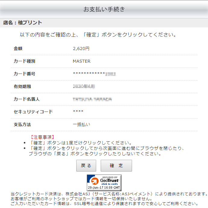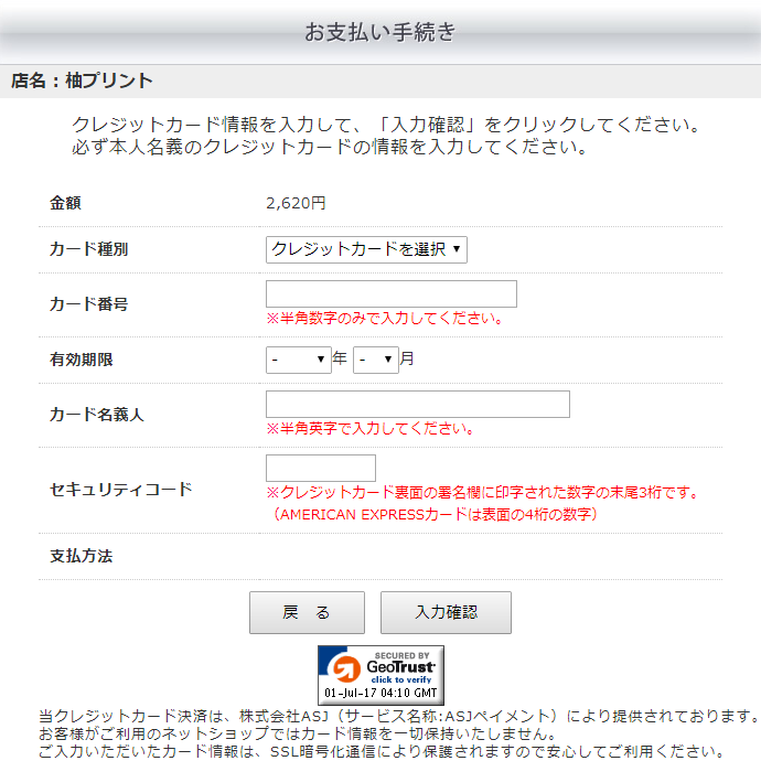当店完全非経由の(株)ASJ「ASJペイメント」を使用。決済用URLは出荷メールに記載。決済手数料不要。別名義での決済可能。また、決済画面は会社名「柚プリント」となります。