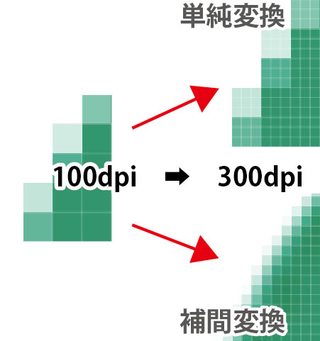 B5→A0等の解像度変換時、まれに補間なし単純変換データがあり、仕上がりに良い結果が得られません。図の3倍単純解像度変換では1ピクセルが3x3ピクセルになりジャギーはそのままです。補間拡大できない場合は拡大ぜず入稿ください。