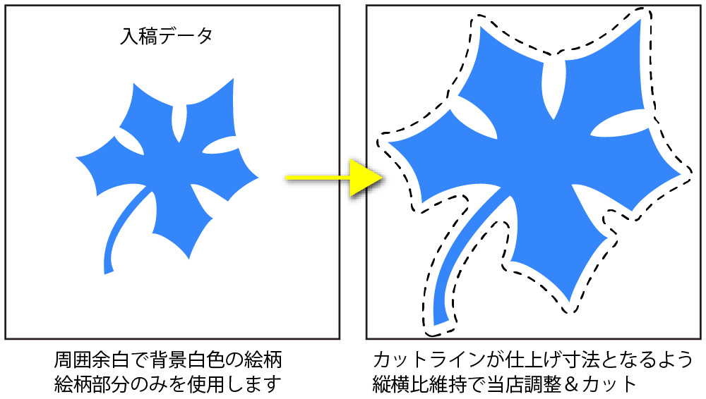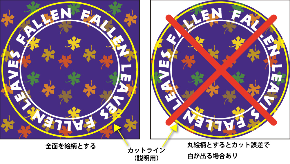 円形にカットするので全面絵柄として願います。外側余白の丸絵柄の場合、カット誤差で余白が出る場合があります。また、波の形で円の内側も少し断ち落とされること考慮願います。下例では「型抜マル」よりも文字を少し小さくしています。